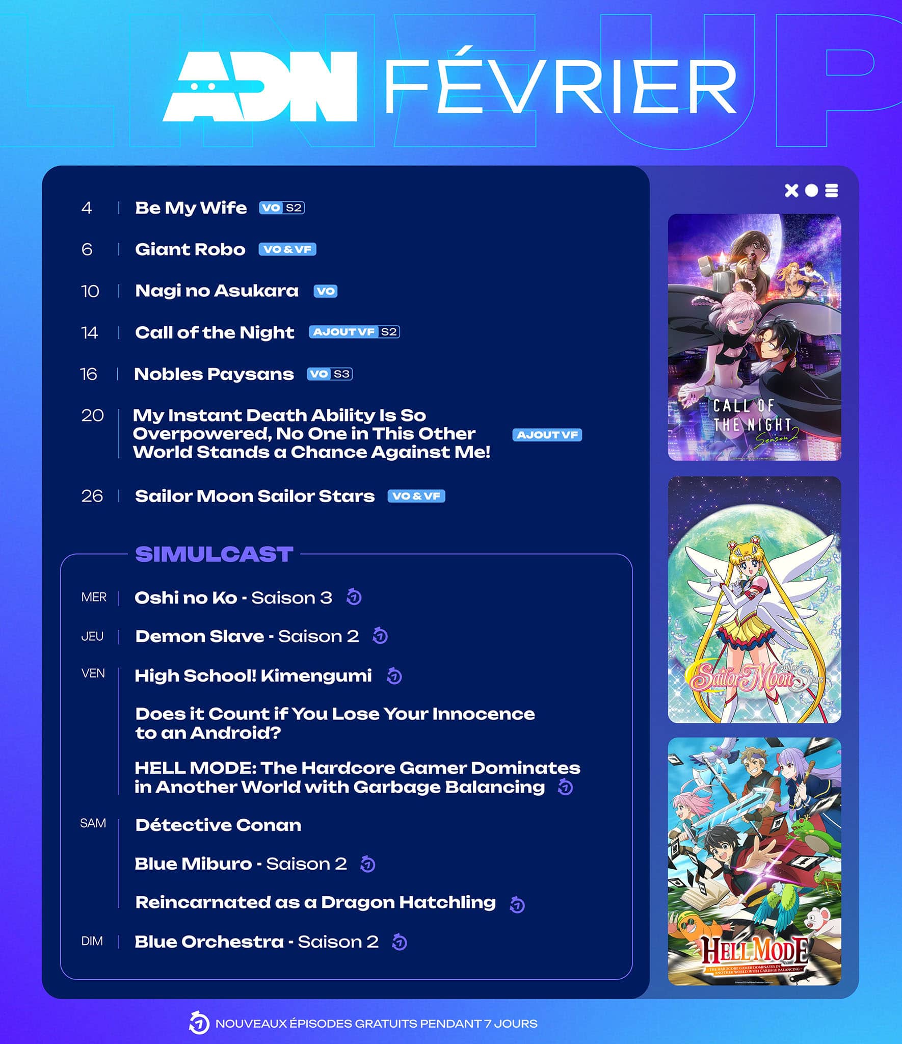 En parallèle des différents ajouts au catalogue évoqués précédemment, les animes de l’hiver actuellement diffusés en simulcast poursuivront également leur diffusion sur ADN tout au long du mois de février 2026. Pour rappel, voici le programme proposé chaque semaine :