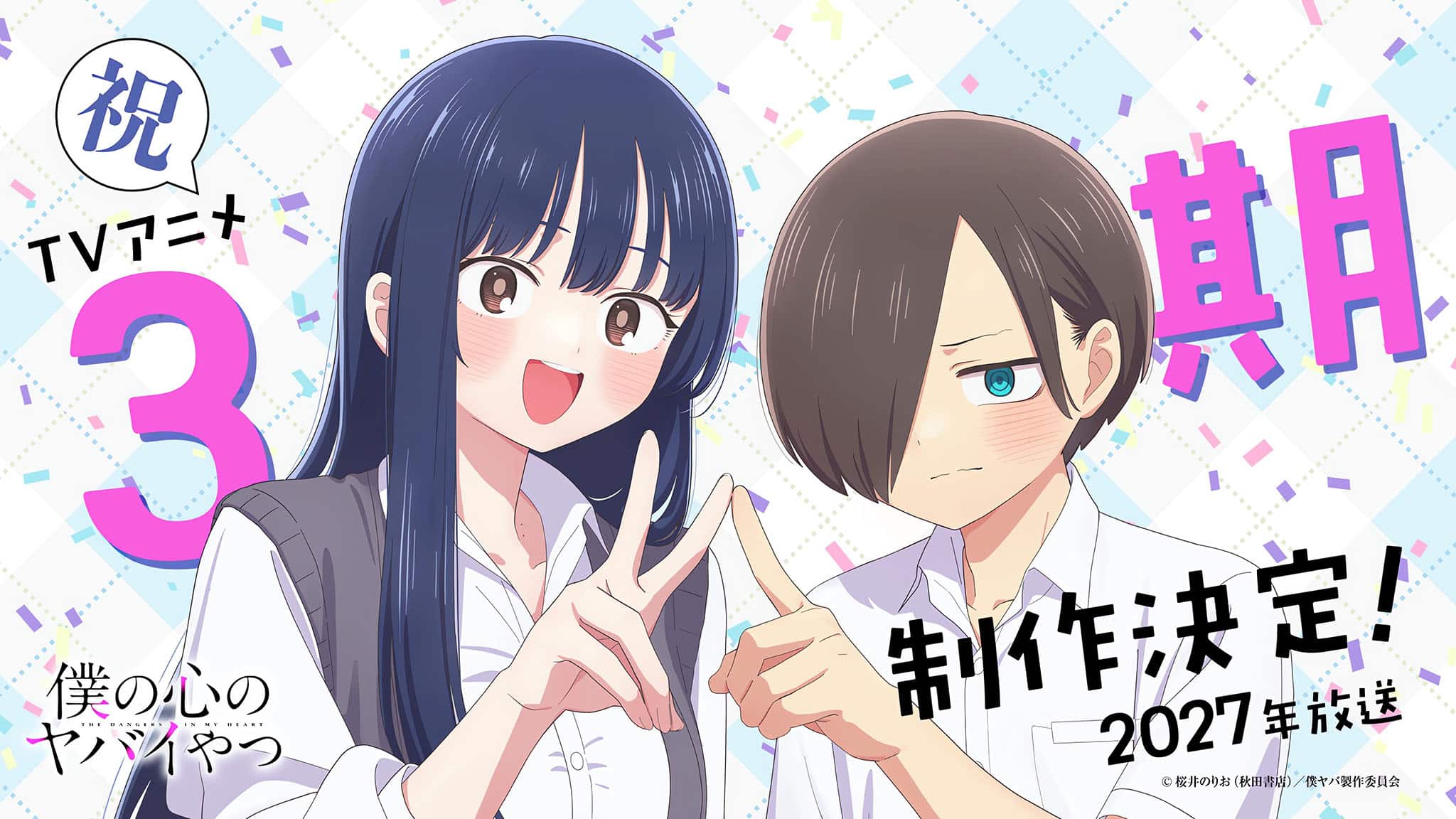 La production de l’anime The Dangers in My Heart saison 3 (Boku no Kokoro no Yabai Yatsu saison 3) a été officiellement annoncée. Cette troisième saison sera diffusée au Japon en 2027. À cette occasion, un message de félicitations de l’autrice Norio Sakurai ainsi qu’une illustration commémorative réalisée par le character designer Masato Katsumata ont également été dévoilés.