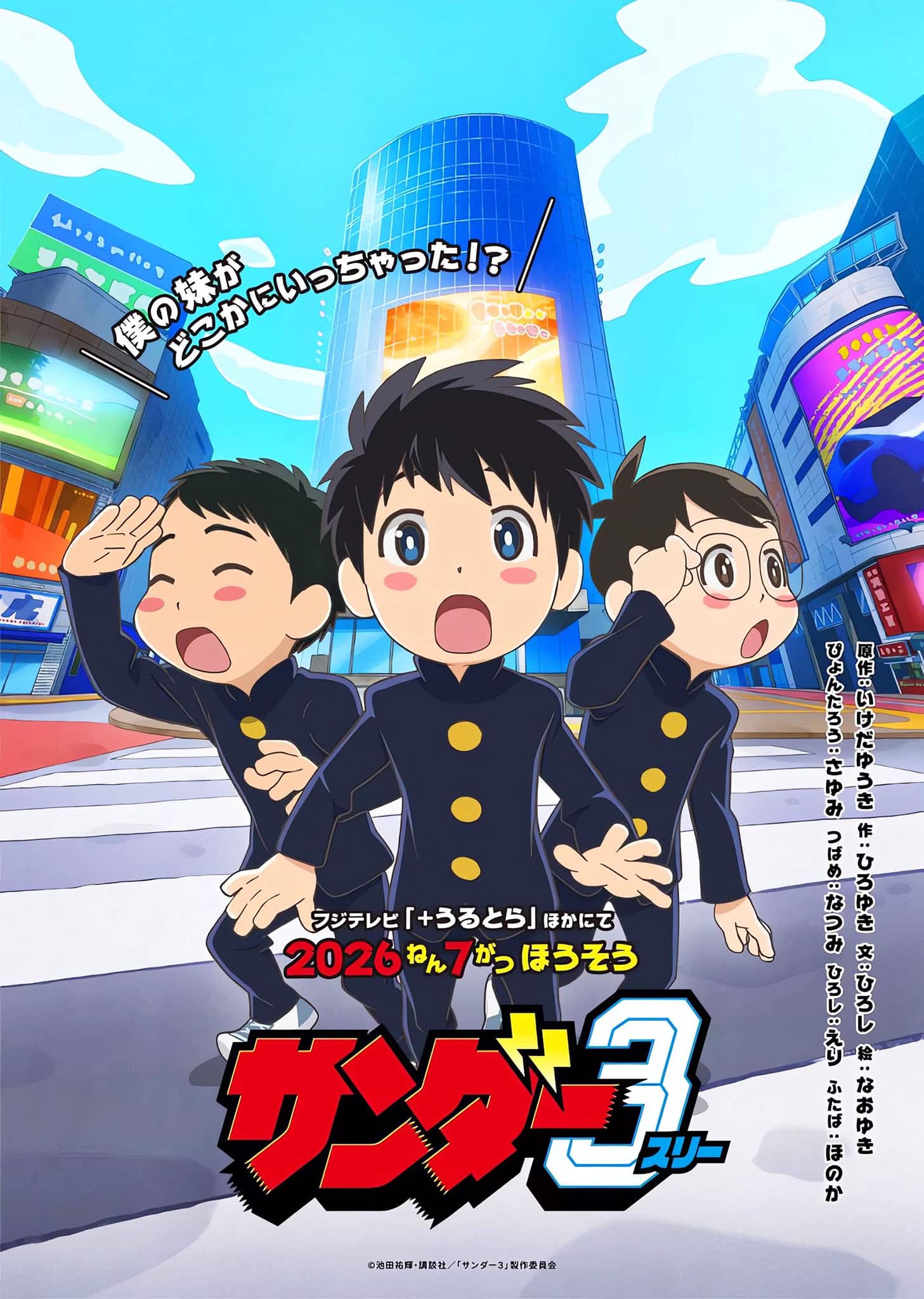 La production de l’anime Thunder 3 (Thunder Three), adapté du manga éponyme de Yuki Ikeda, a été officiellement annoncée, avec une date de lancement prévue pour juillet 2026. Un site web officiel a été mis en ligne à cette occasion. Sur celui-ci, nous découvrons une première bande-annonce ainsi qu’une affiche promotionnelle, accompagnées des principaux membres du casting.